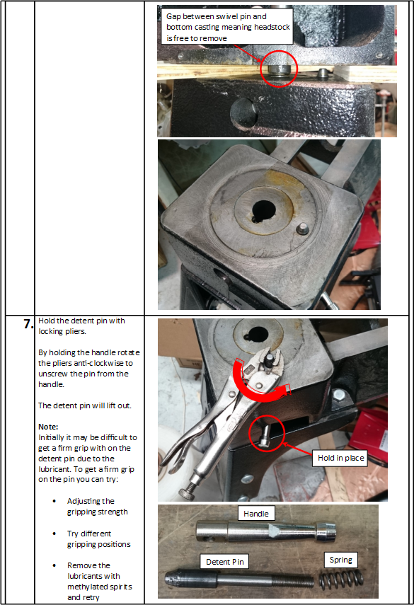 The detent pin is the part which allows the user to lock the headstock in place when engaged.